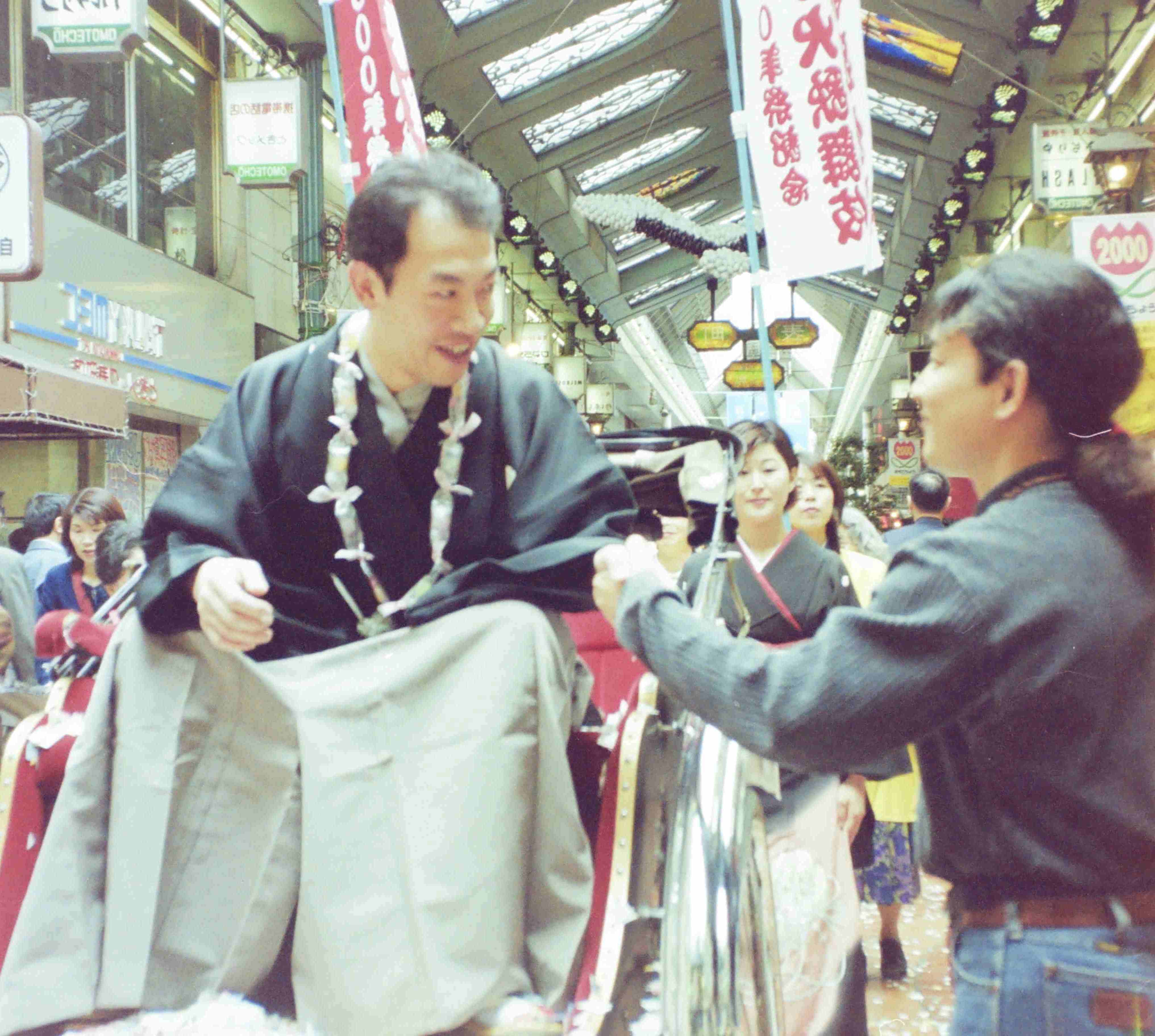 先日都内の知人宅で火災に巻き込まれて急逝された、歌舞伎俳優の片岡亀蔵酸(64歳)の死に大きな衝撃を受けています。写真は「四国こんぴら歌舞伎大芝居」のお練りが岡山市表町商店街であった時の物で、人力車に乗る片岡亀蔵さんと真悟先生が固く握手しています。