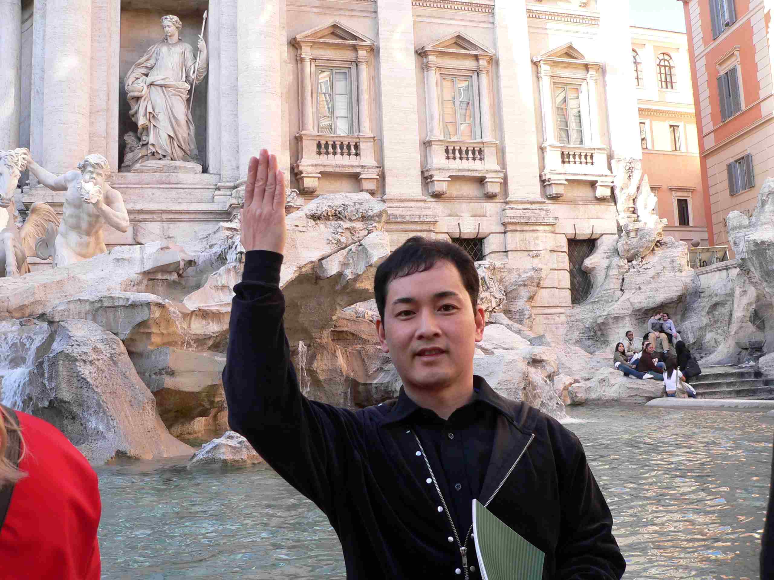 写真はトリノ五輪の時に寄ったローマにあるトレビの泉にて、コインを後ろ向きに投げている真悟先生です。