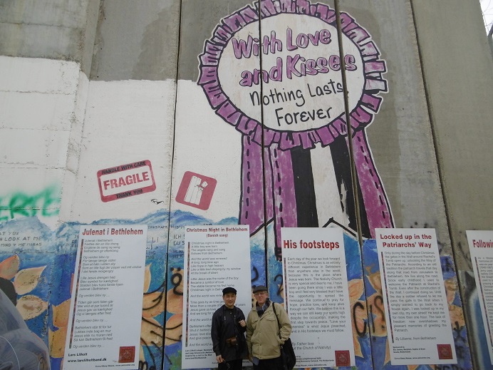 真悟先生の背後の壁は、パレスチナ人とユダヤ人の生活を隔てる分離壁です。イスラエル取材に行った当時は内戦も治まっていた時期なので、緊張感も薄く壁の前で記念撮影が出来ました。