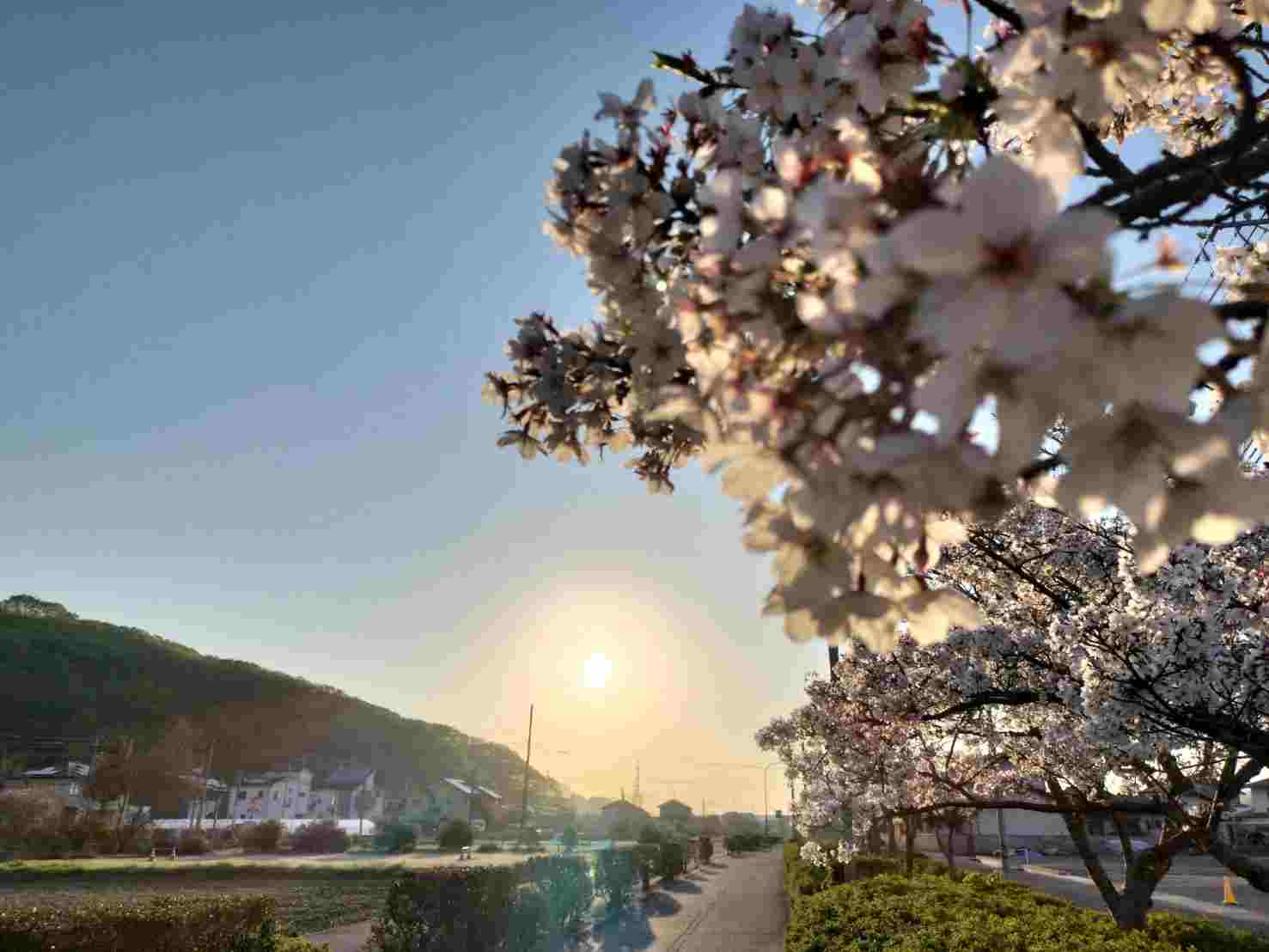 これは、今朝のウォーキングの時に遊歩道から撮った桜と日の出です。