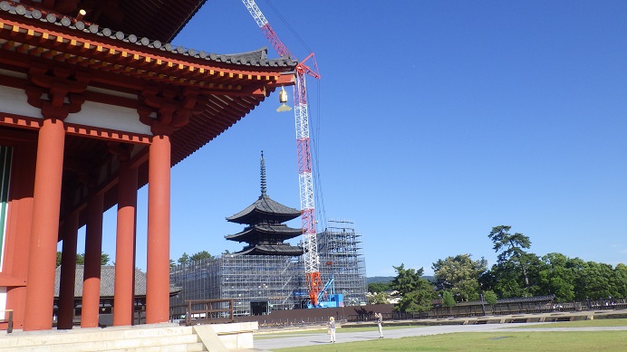 中金堂からのぞむ五重塔の姿です。修復工事の為の足場を組むだけでも凄い作業ですね。