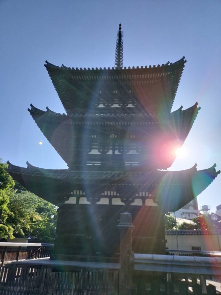 興福寺の三重塔(国宝)です。五重塔は有名ですが三重塔は境内の片隅にあり、観光客もほとんど訪れていません。平安時代の建築様式を伝える貴重な建物です。真悟先生が写した写真ですが、七色の光が写りました(^o^)/