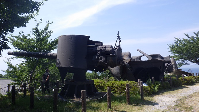 沈没現場の海を望む丘の公園には戦艦陸奥の船体が展示されています。