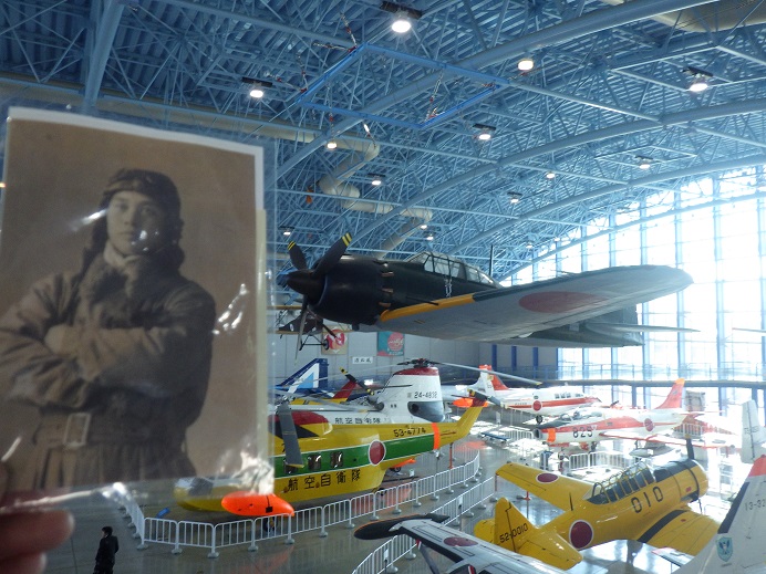 伯父は瑞鶴航空隊のゼロ戦パイロットでした。この写真は、浜松エアパークに展示されているゼロ戦(本物)の前で伯父の遺影をかざしている写真です。