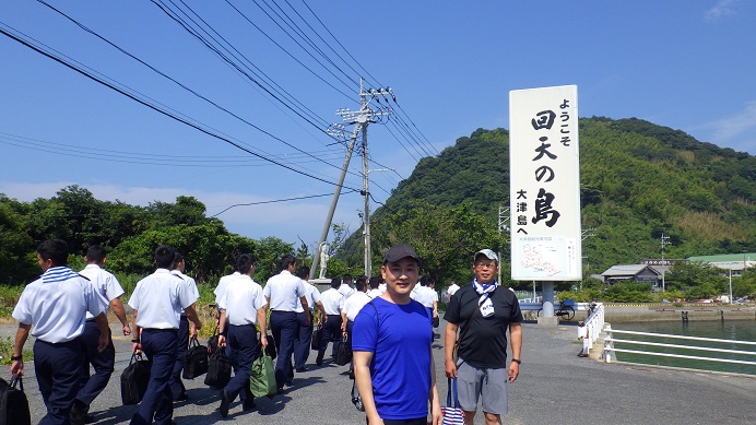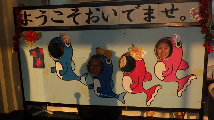 7月25日の午前中は特設水上機母艦「聖川丸」の慰霊法要、午後からは周防大島に移動し、戦艦「陸奥」の慰霊に行きお祈り三昧の半日を過ごした後は、いつも泊まるホテル周防大島大観荘で過ごしました。早速金魚に変身・・パネル記念撮影は旅のあるあるですね。