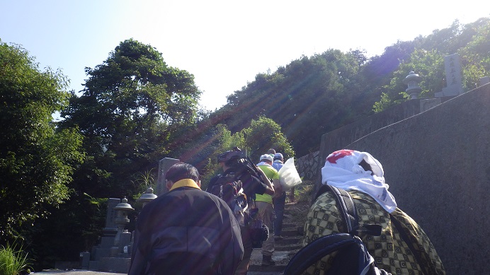 慰霊塔のある頂上に到着!すでに村の人達は集合して下さっていましたので、さっそくお坊様の読経と共に慰霊法要が開始されました。志田沖海戦当時、志田村のお寺の住職は徴兵されて村にはおらず、お隣の平生(ひらお)町にある法隆寺の住職が供養にかけつけました。