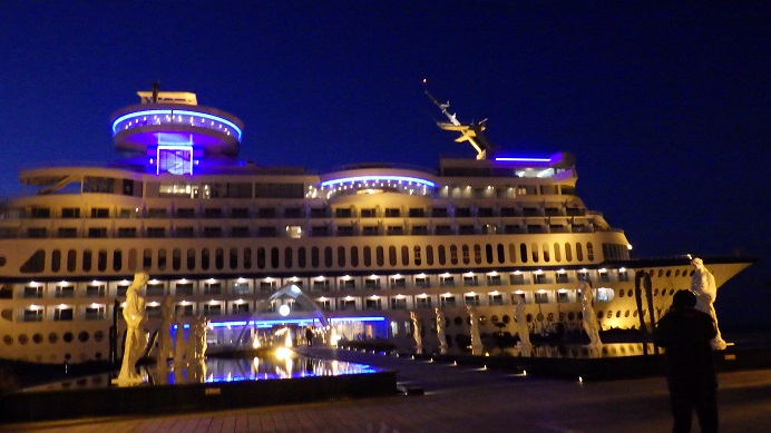 後ろの豪華客船は海に浮いているのではなく、陸にあげられた船のホテルです。オリンピック時はホテル確保が大変ですが、直前に運よくこのホテルの予約が信じられないほどの低価格でゲットできました。