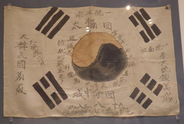 最初、日章旗?と間違えたこの旗・・。ハングル文字では無く漢字なので意味が分かりやすいです。