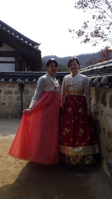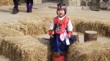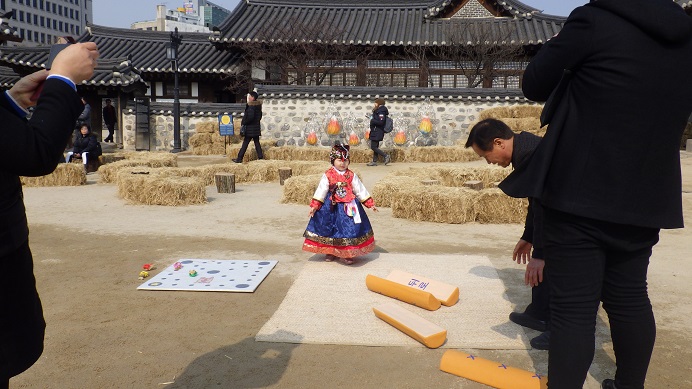 日本の晴れ着にあたる、韓国の民族衣装を着た女の子・・お人形さんのように可愛いぃ~♥この女の子が座っている椅子は藁(わら)で出来ていて、腰かけてみると信じられないくらい優しくて座り心地の良い椅子でした。