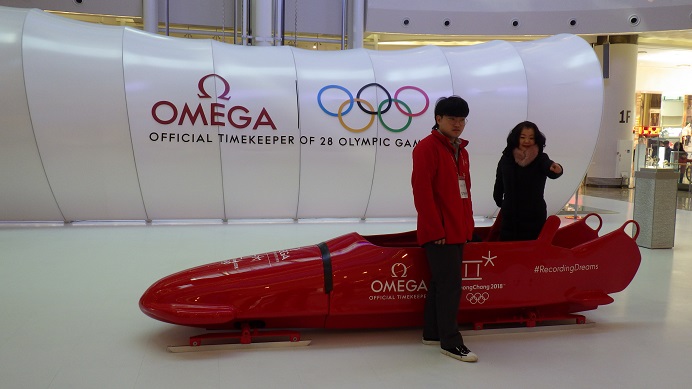 今まで訪れたオリンピック開催国で必ず出会うのが、オメガ社の宣伝です。赤いボブスレーに又会えたぁ~って感じです。