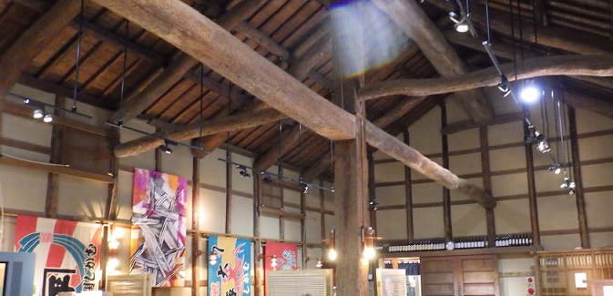 「蔵ほーる」は、江戸時代に北前船(きたまえぶね)で北海道から運んできた海産物を貯蔵していた蔵をそのまま利用しています。なので、大きな天然木のハリの太さは驚きです。