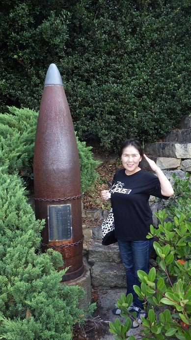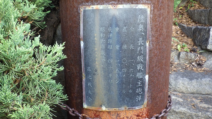 この砲弾は、「戦艦睦奥(むつ)」や「戦艦長門(ながと)」の主砲に使われた種類の砲弾という事が、説明版に書かれてあり、この時期にこの砲弾を見つけたのは、とても不思議な御縁を感じます。戦艦睦奥は、今日から向かう山口県上関のすぐ近くの周防大島の沖で、昭和18年(1943年)6月8日に謎の大爆発を起こし沈没してしまい沢山の戦死者を出しました。