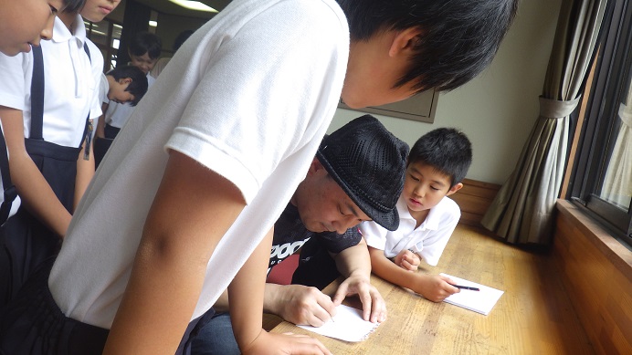 子供達は、ノートの切れ端などを持ってきたので、真悟先生は子供にエンピツを借りてサインを一生懸命に書きました。アニマルアート・ミュージアムとして、この事態に反省して後日真悟先生に子供達へのプレゼントとして、絵はがきにサイン入れてもらいました。