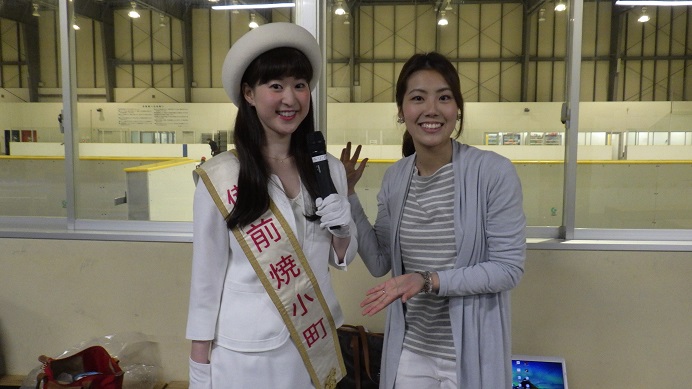 昨日は「備前焼小町」のアスカさんがスケートリンクに撮影の為、突然の来場!聞いていなかったので、驚くやら嬉しいやら(*^-^*)右はRSK放送の「笑みちゃん天気予報」で昨年度まで活躍していた、マユちゃんです。