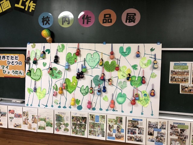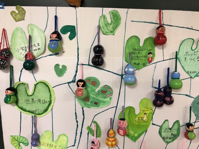 ひょうたんの蔓に成っているひょうたんにはカラフルな自画像、そして葉っぱには自分の将来の夢が描かれ、子供らしい素晴らしい作品に成っていました。子供の想像力を引き出せたのは、やはり真悟先生のアイディアと指導の賜物だと思います(^^)v