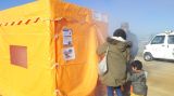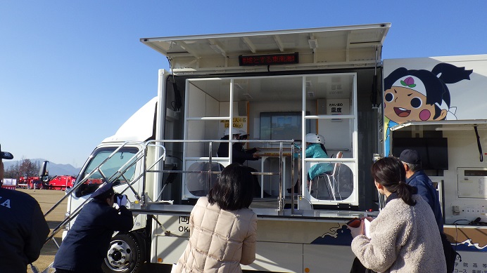 この黄色いテントの中は煙が充満しています。入り口から入り、無事に反対側の出口から脱出したら成功!