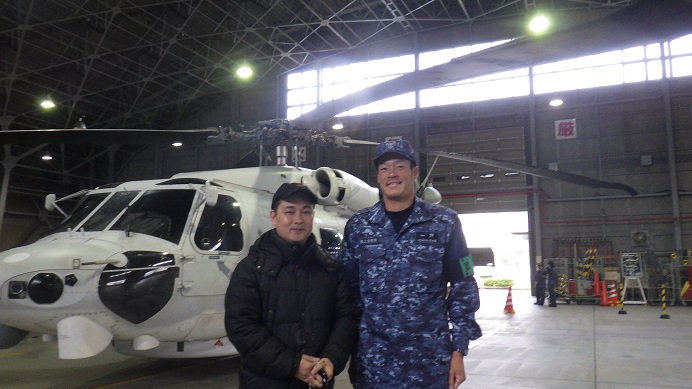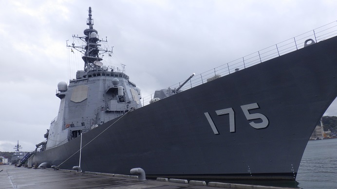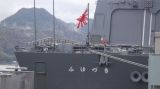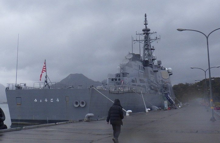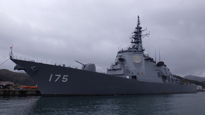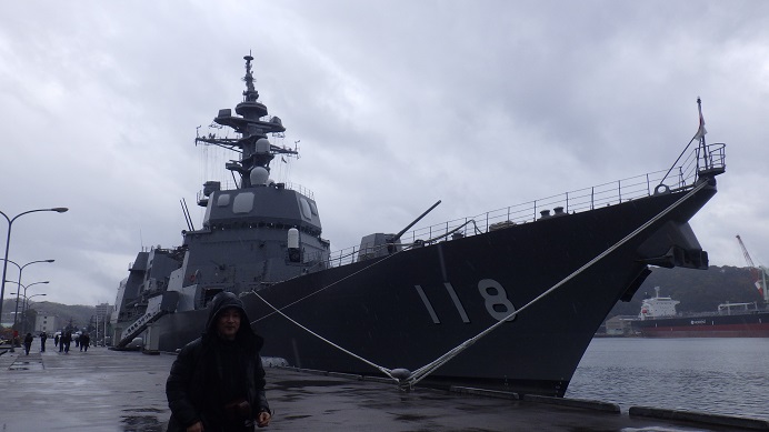 今度は海上からではなく、北吸桟橋から自衛艦艇を取材しました。真悟先生の後ろに碇泊しているのが汎用護衛艦「ふゆづき」です。