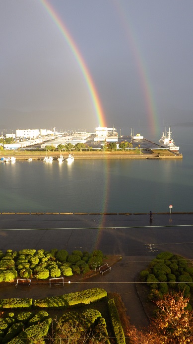 その虹は私達のホテルの真下の公園から生えて居るではありませんか!長崎を訪れてから、毎日キリシタンの事を思い続けている日々の中に、京極マリア様の存在を知り舞鶴まで導かれてきました。
