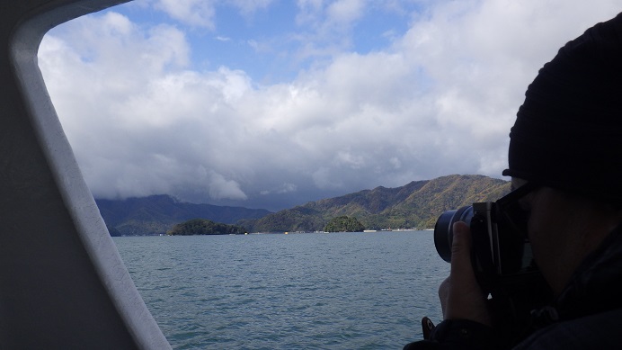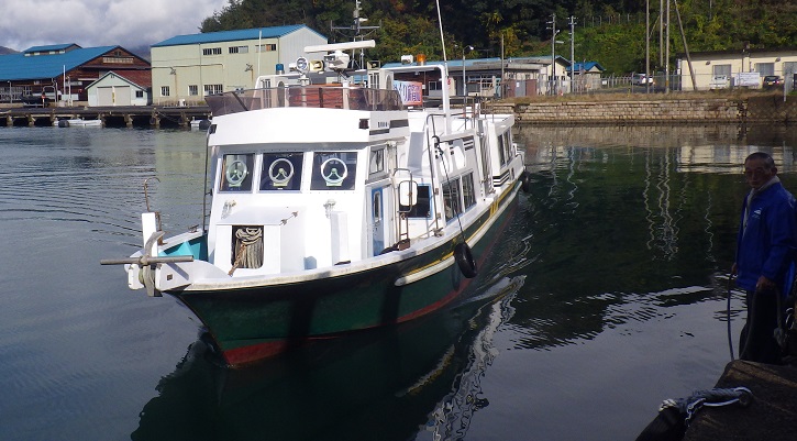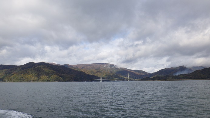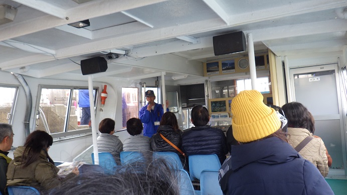 向こうに見える小さな島は、右が烏島(からすじま)左が蛇島(じゃじま)です。ガイドさんは、この湾で起きた色々な出来事を説明してくださいましたが、その中にとてもショッキングなお話がありました。