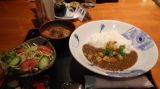 このカレーは掃海艇「のとじま」のナスと合い挽き肉のキーマカレーです。それに、海軍伝承の肉じゃがもついてます。