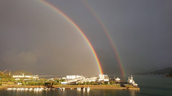 写真の虹は昨日の朝、ホテルの窓から写したダブルレインボーです。