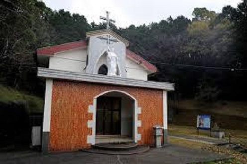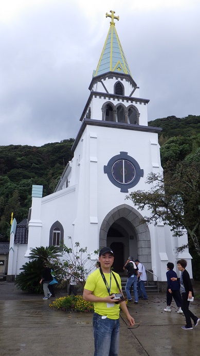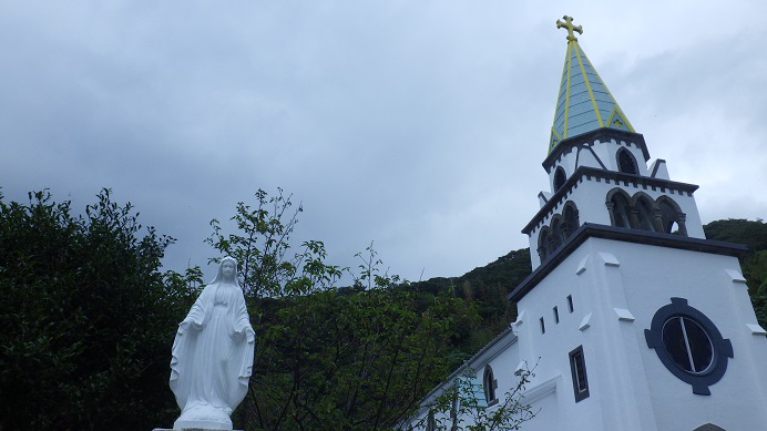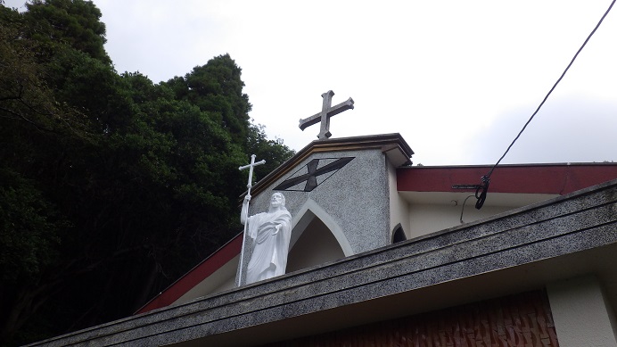 港からタクシーに乗り、浜辺の道を5分ほど走行すると浜脇教会に到着しました。1800年前後に、本土から逃れた潜伏キリシタン達は明治初期までつづく迫害を乗り越え、1881年(明治14年)に最初の教会(浜脇教会)を造りました。