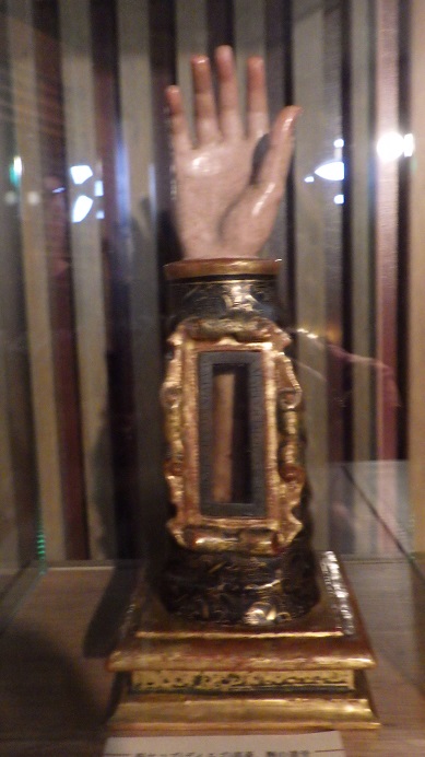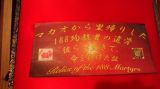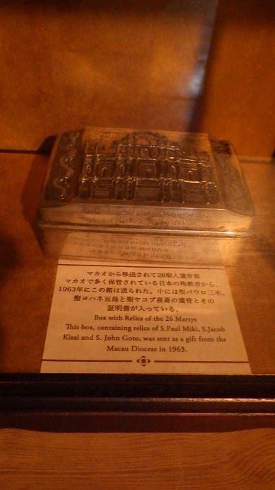 処刑終了後、彼らの遺骸は多くの人々の手で分けられ、日本で最初の殉教者の遺骸(聖遺物)として世界各地に送られて崇敬を受け続けています。この箱は、マカオから戻された殉教者(聖パウロ三木、聖ヨハネ五島、聖ヤコブ喜斎)の御遺骨が入っているそうです。