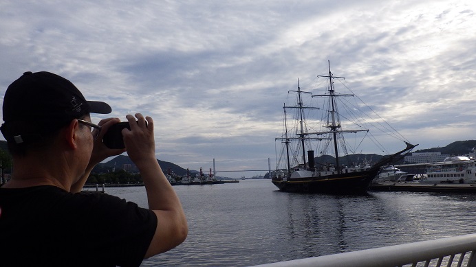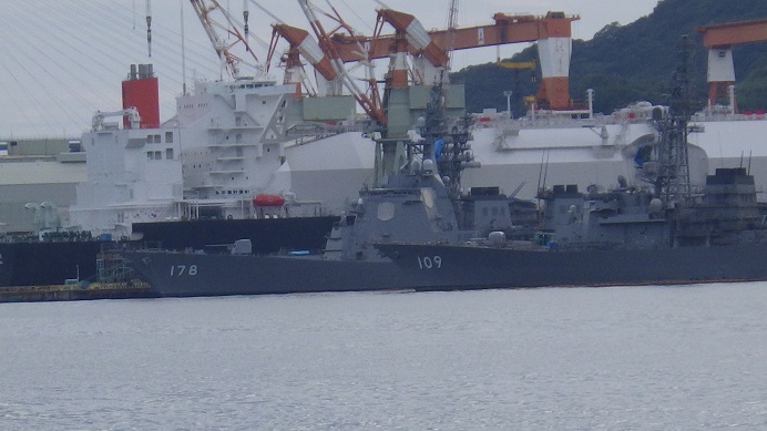 そして、全く予定していなかった自衛艦に港で遭遇!自衛隊に超詳しい真悟先生が「向こうの178はイージス艦『あしがら』で、手前の109は汎用(はんよう)艦『ありあけ』だ。」と説明してくれました。